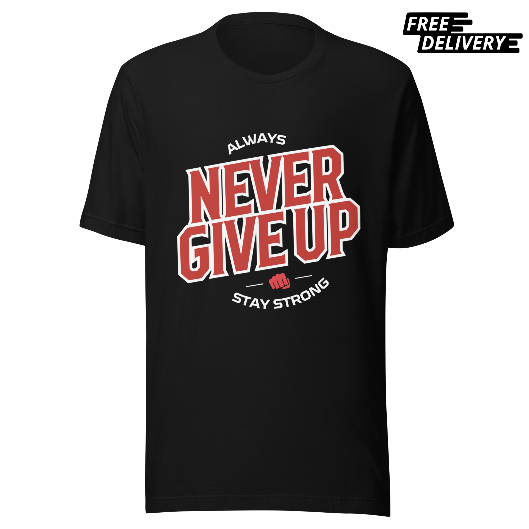 Fuel your hustle. This high-impact design features a bold “Always Never Give Up” message paired with a “Stay Strong” mantra. With its clean, athletic typography and striking red-and-white contrast, this tee is designed for those who push through every challenge and keep their eyes on the prize.