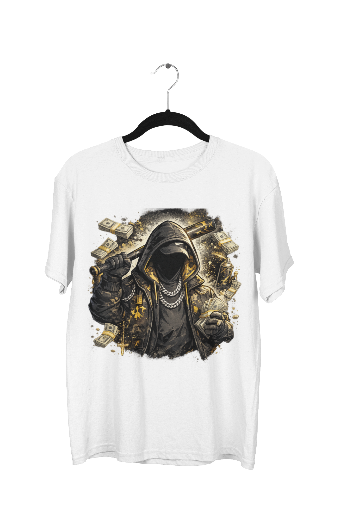 Command the room. This oversized statement piece features a gritty, hooded figure surrounded by stacks of cash in a striking black and gold aesthetic. The heavy-hitting graphic is paired with a loose, modern fit, making it the ultimate piece for those who value the daily grind and high-contrast urban style.