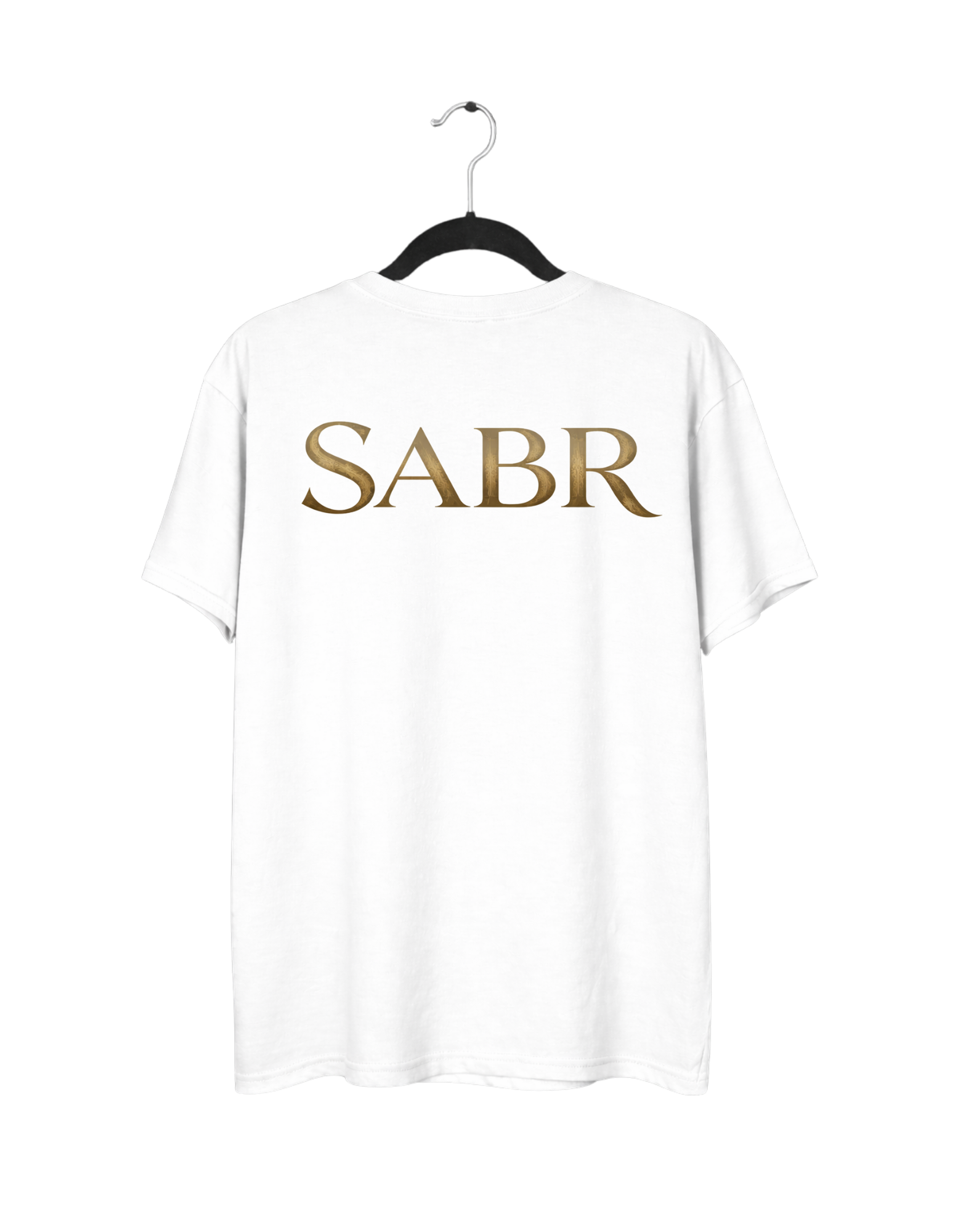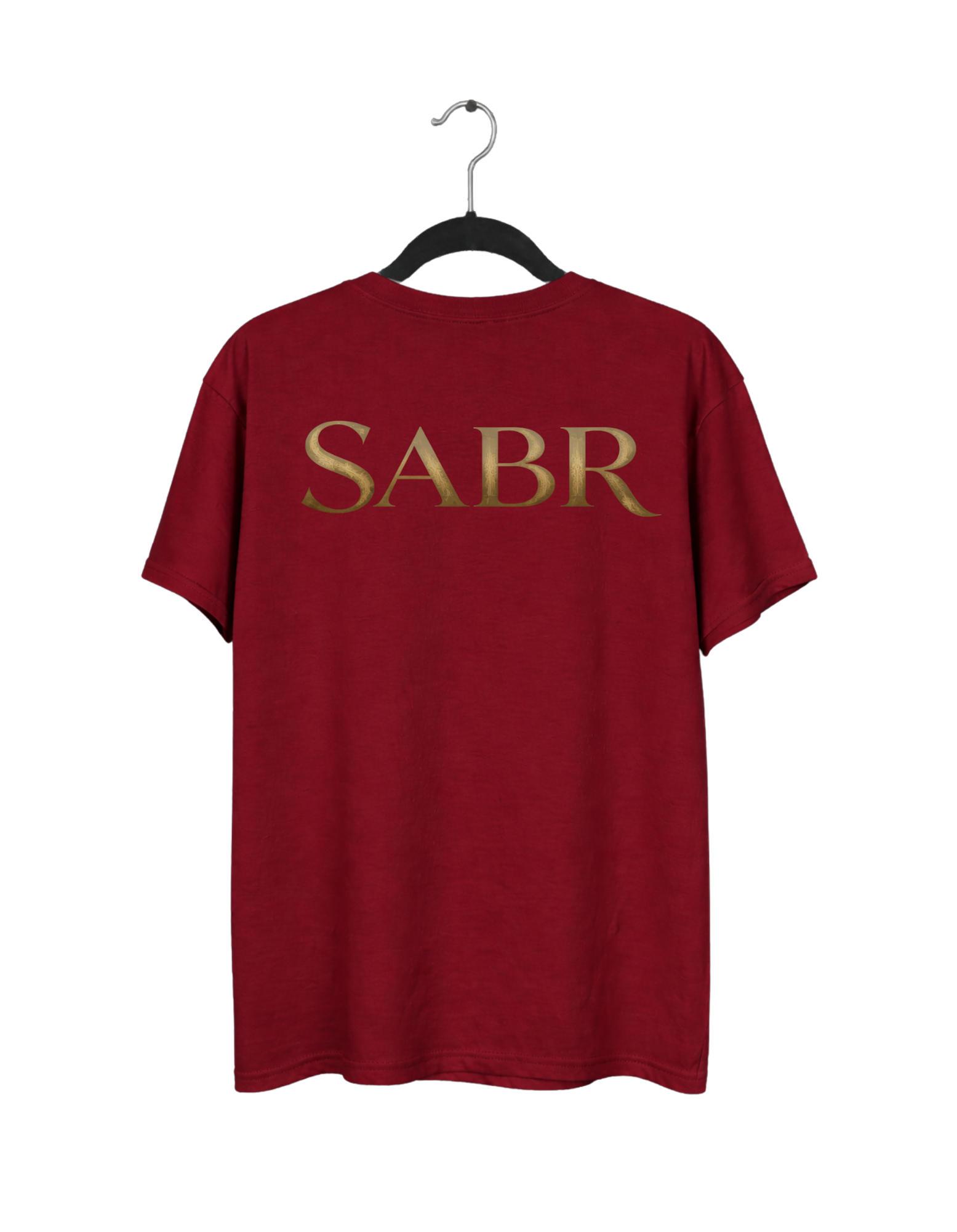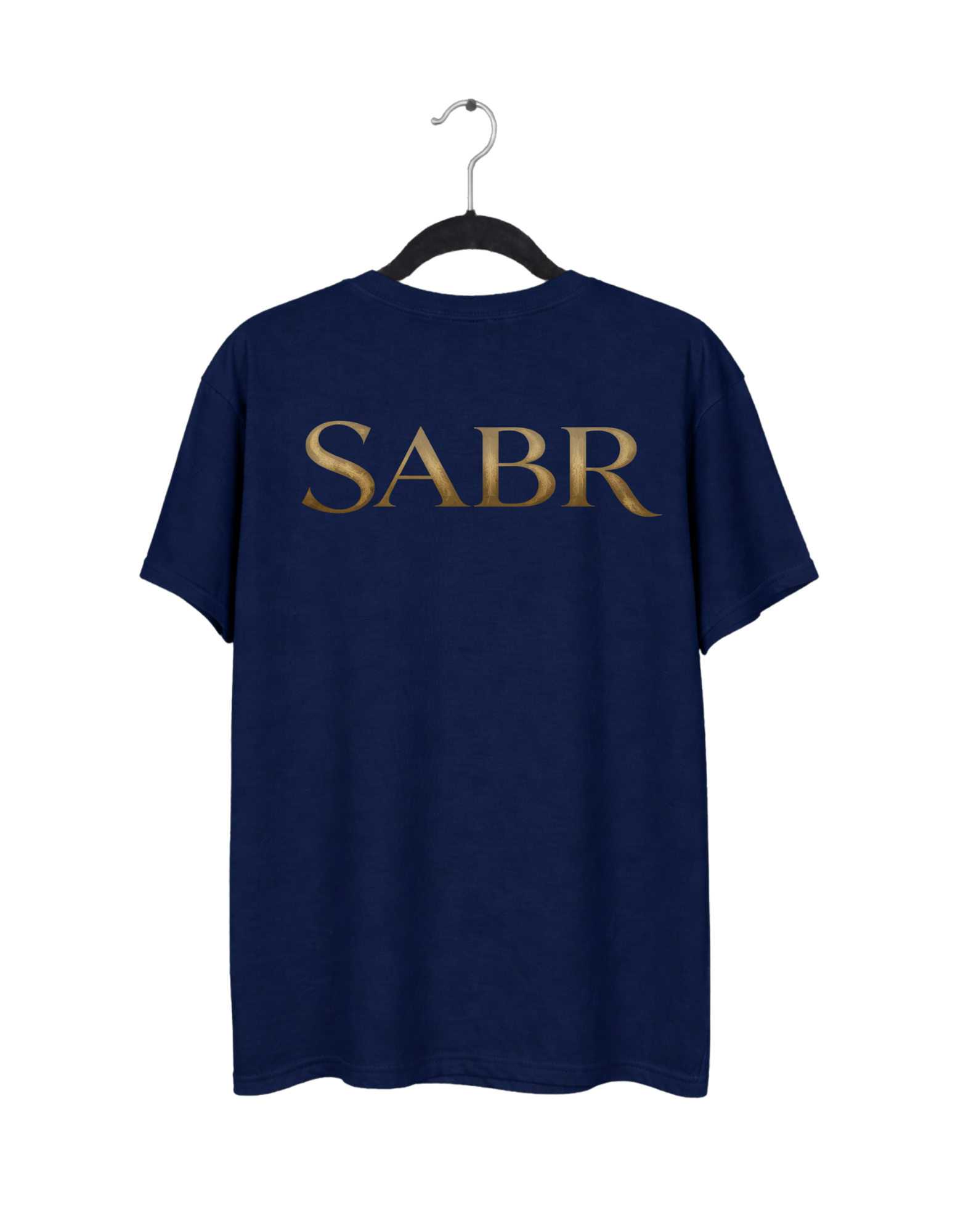 The front features a sophisticated, gold-toned “SABR” logo accented with a crescent moon and stars. The back showcases a clean, minimalist illustration of a believer in prayer, symbolizing hope and reliance on the Almighty.